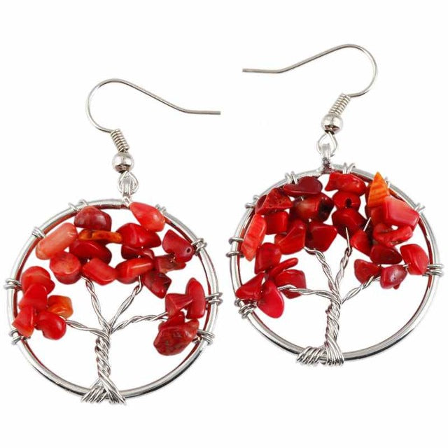 Bohemian style 7 Chakra tree of life round shape drop earrings with a natural round gem stone bead Reiki healing...