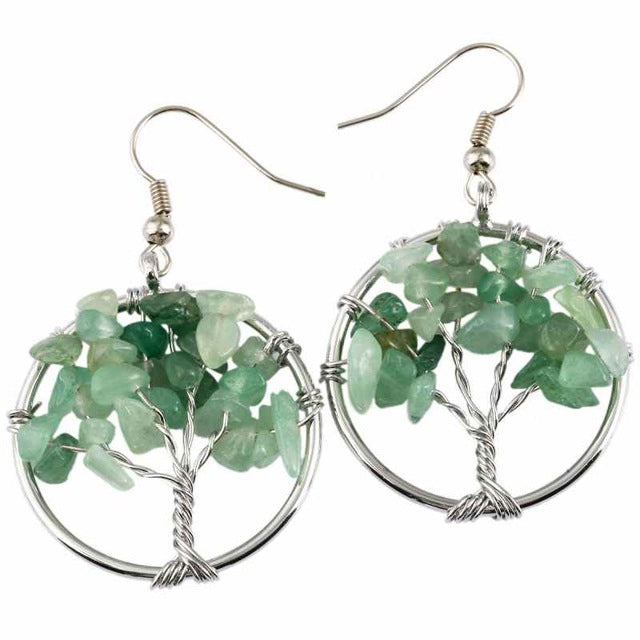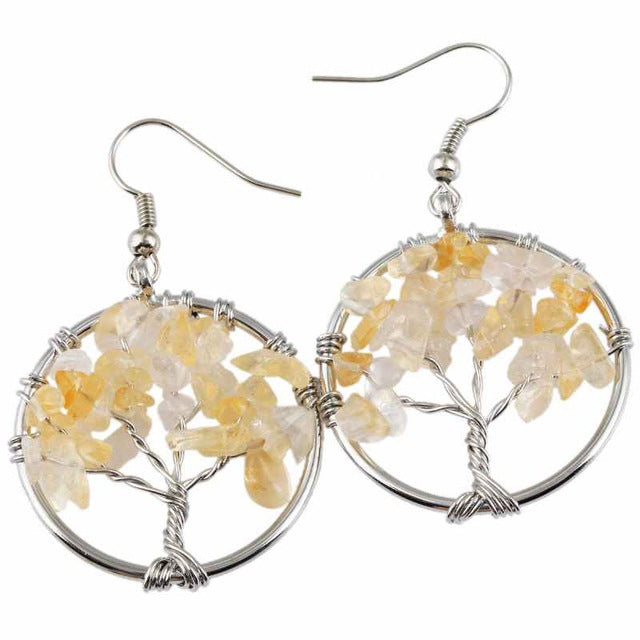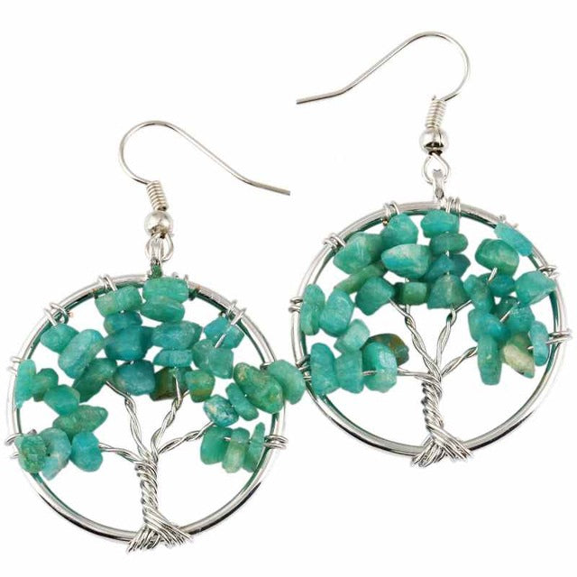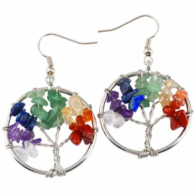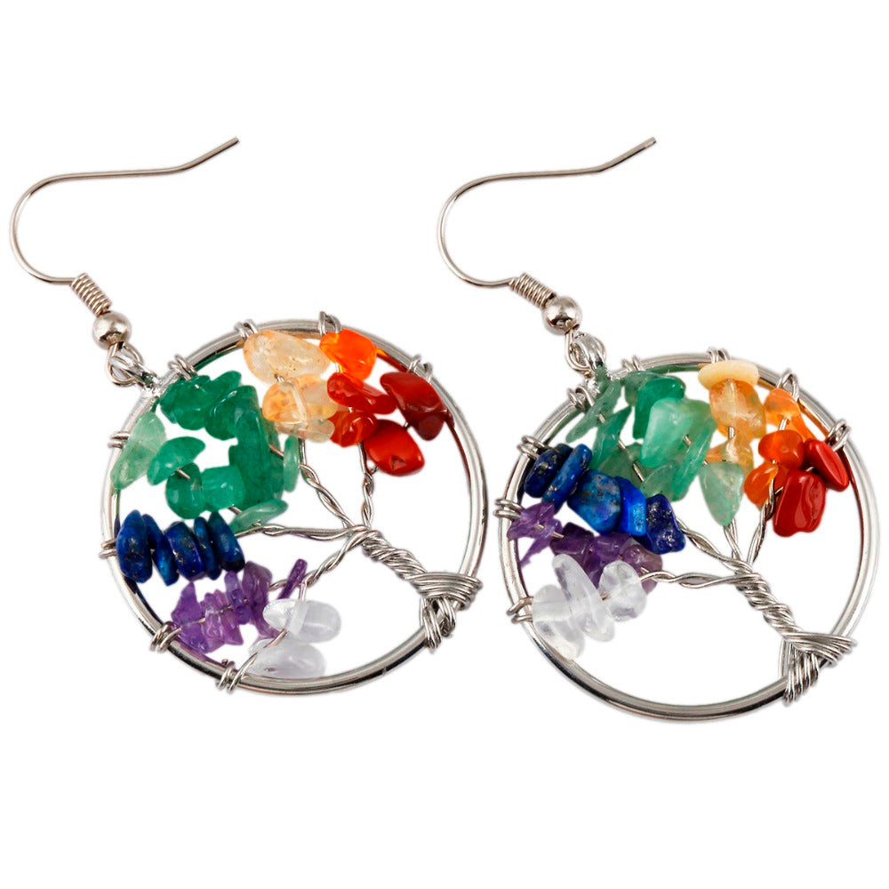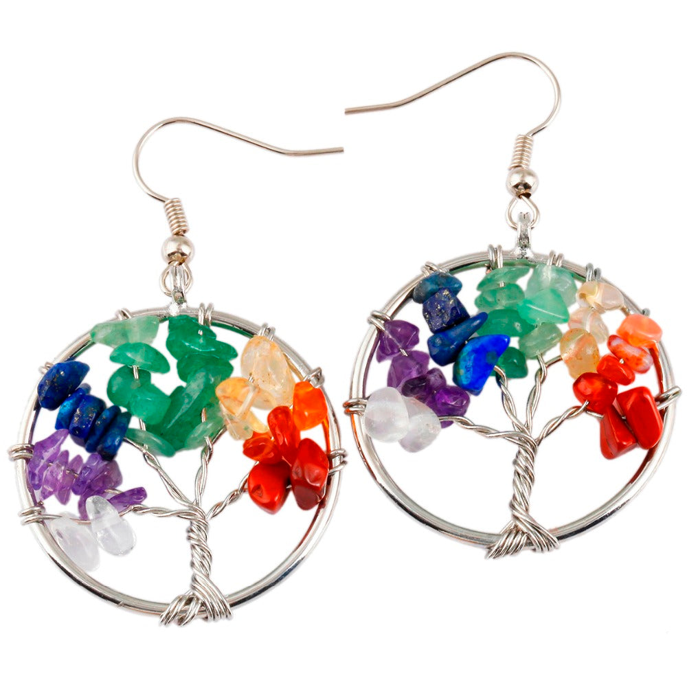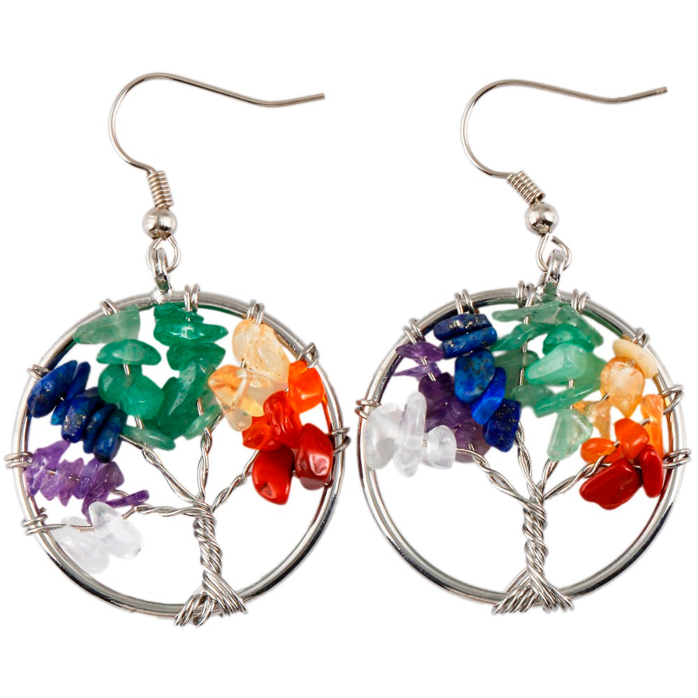 Bohemian style 7 Chakra tree of life round shape drop earrings with a natural round gem stone bead Reiki healing...